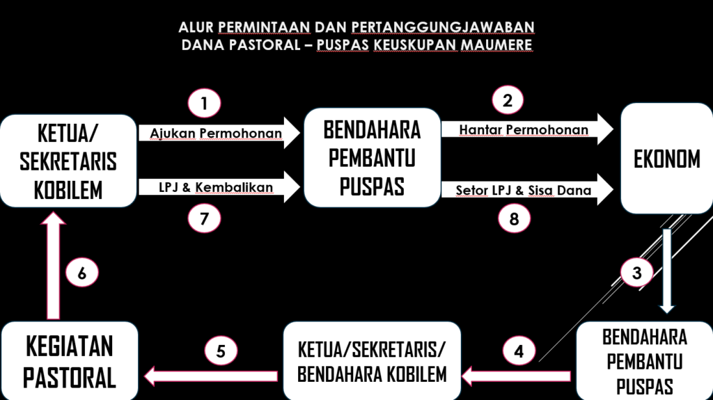 Dalam menjalankan kegiatan pastoral para staf administrasi dan keuangan komisi dan biro mengikuti alur prosedural seperti dalam gambar, dengan beberapa catatan berikut: